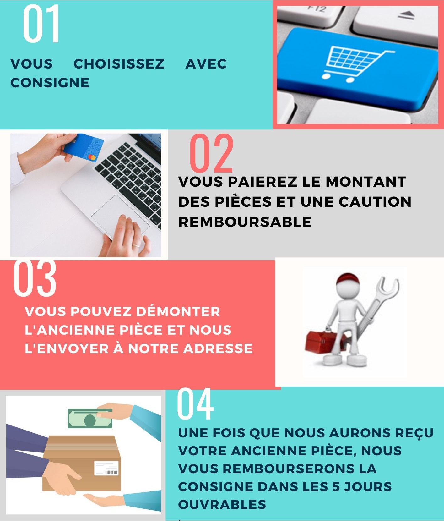 When you order from us, you will pay the amount of parts and a refundable deposit. After receipt of the order, you have 30 days to return your old parts to us and obtain a refund of the deposit.